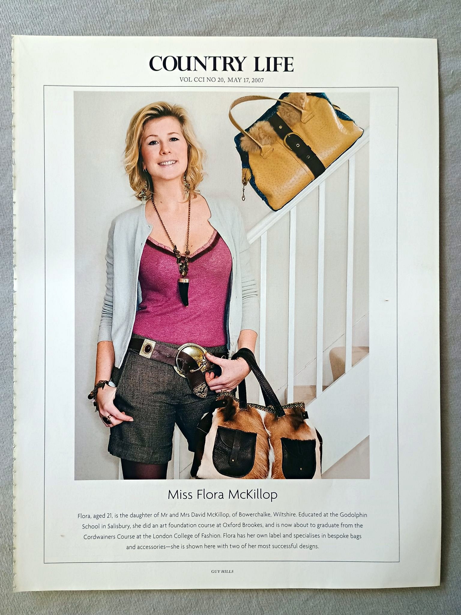 Miss Flora McKillop - Flora, aged 21, is the daughter of Mr and Mrs David McKillop, of Bowerchalke, Wiltshire. Educated at the Godolphin School in Salisbury, she did an art foundation course at Oxford Brookes, and is now about to graduate from the Cordwainers Course at the London College of Fashion. Flora has her own label and specialises in bespoke bags and accessories-she is shown here with two of her most successful designs.